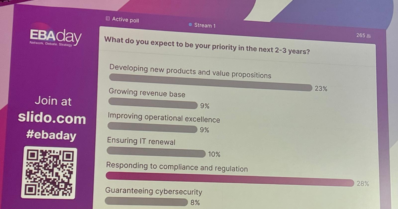 Following the Swiss meeting, I was then honoured to moderate an opening panel at EBAday with representatives of JPMorgan and Deutsche Bank. We had a wide ranging discussion but, similar to the details of CRD VI, a lot of regulations came up as top-of-mind. MCiA, EUID, CRDVI, PSD3, EUAI etc and it did intrigue me that, when the audience were polled about their #1 priority, it was regulations and compliance.