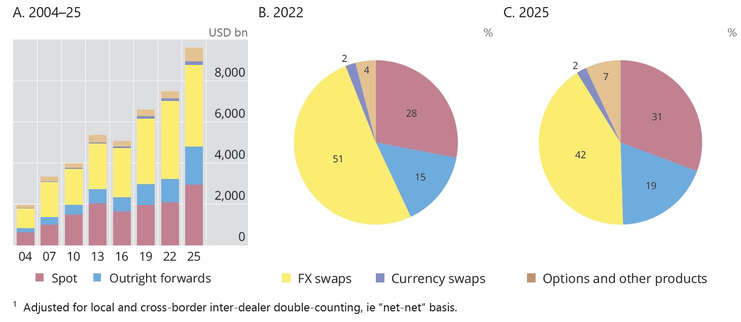 - Trading in OTC FX** markets reached $9.6 trillion per day in April 2025, up 28% from $7.5 trillion three years earlier.