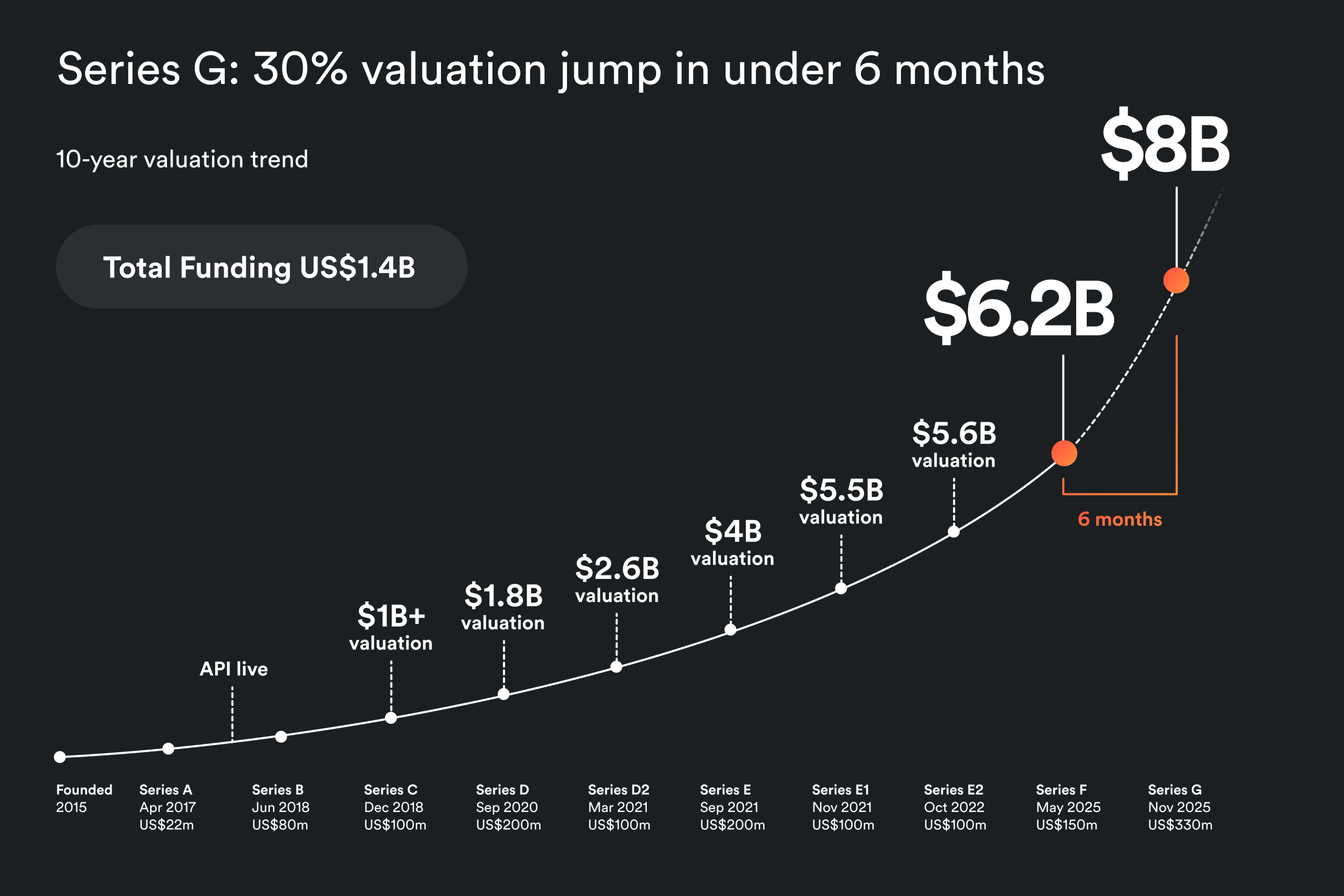 Anyways, they’ve just made a major announcement today. The announcement is a valuation of $8 billion based upon $300 million in new funding through investors T. Rowe Price, Activant, Lingotto, Robinhood Ventures, TIAA Ventures, and led by Addition. This pushes their valuation to $8 billion, just a little bit more than Stripe offered, and represents a significant 30% jump in valuation in just six months.